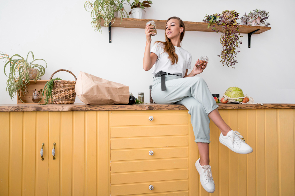 Accesoriile sunt detalii care dau viață spațiului. Coșurile din răchită, suporturile din lemn, plantele aromatice în ghivece simple sau borcanele din sticlă contribuie la atmosfera rustică. Important este să păstrezi un aspect ordonat.